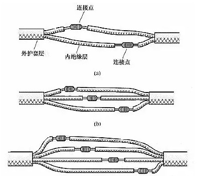 雙芯或多芯電線電纜的連接雙芯護套線三芯護套線或電纜多芯電纜在連接時,應(yīng)注意盡可能將各芯線的連接點互相錯開位置,可以更好地防止線間漏電或短路圖6(a)所示為雙芯護套線的連接情況,圖6(b)所示為三芯護套線的連接情況,圖6(c)所示為四芯電力電纜的連接情況。