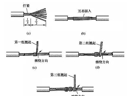 對接的2根多股銅線分別批去一段絕緣皮,分別將一小段(約10CM,線截面越大長度延長)多股銅線分開成喇叭形狀(剩余雙向原多股銅線約5CM,線截面越大長度延長)后間隔對扦用膠鉗壓實,雙向外單線逐根纏繞而成。