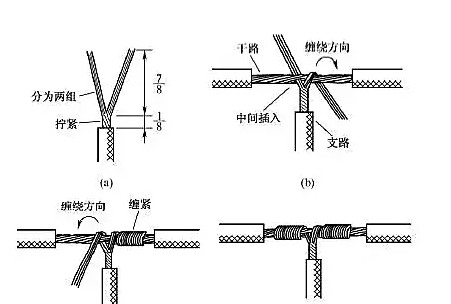 另一種方法如圖3所示,將支路芯線靠近絕緣層的約1/8芯線絞合擰緊,其余7/8芯線分為兩組[見圖3a)],一組**干路芯線當(dāng)中,另一組放在干路芯線前面,并朝右邊按圖3(b)所示方向纏繞 4~5圈再將**干路芯線當(dāng)中的那一組朝左邊按圖3(c)所示方向纏繞4~5圈,連接好的導(dǎo)線如圖3(d)所示。