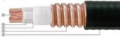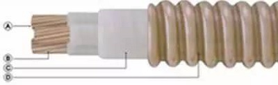 A. 導(dǎo)體:絞合銅導(dǎo)體;B. 絕緣:合成云母帶;C. 填充:無機(jī)材料;D. 銅套:縱包焊接并軋紋