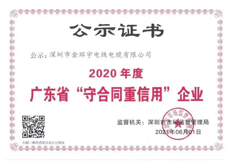 祝賀金環(huán)宇榮獲2020年度“廣東省守合同重信用企業(yè)”稱號(hào)